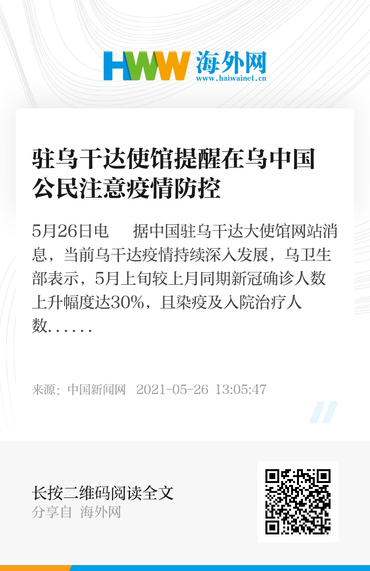 中新网5月26日电 据中国驻乌干达大使馆网站消息,当前乌干达疫情持续深入发展,乌卫生部表示,5月上旬较上月同期新冠确诊人数上升幅度达30%,且染疫及入院治疗人数呈低龄化趋势。此外,据驻乌干达使馆了解,最近又有多名旅乌侨胞确诊,使馆已对他们表达慰问并提供必要帮助。