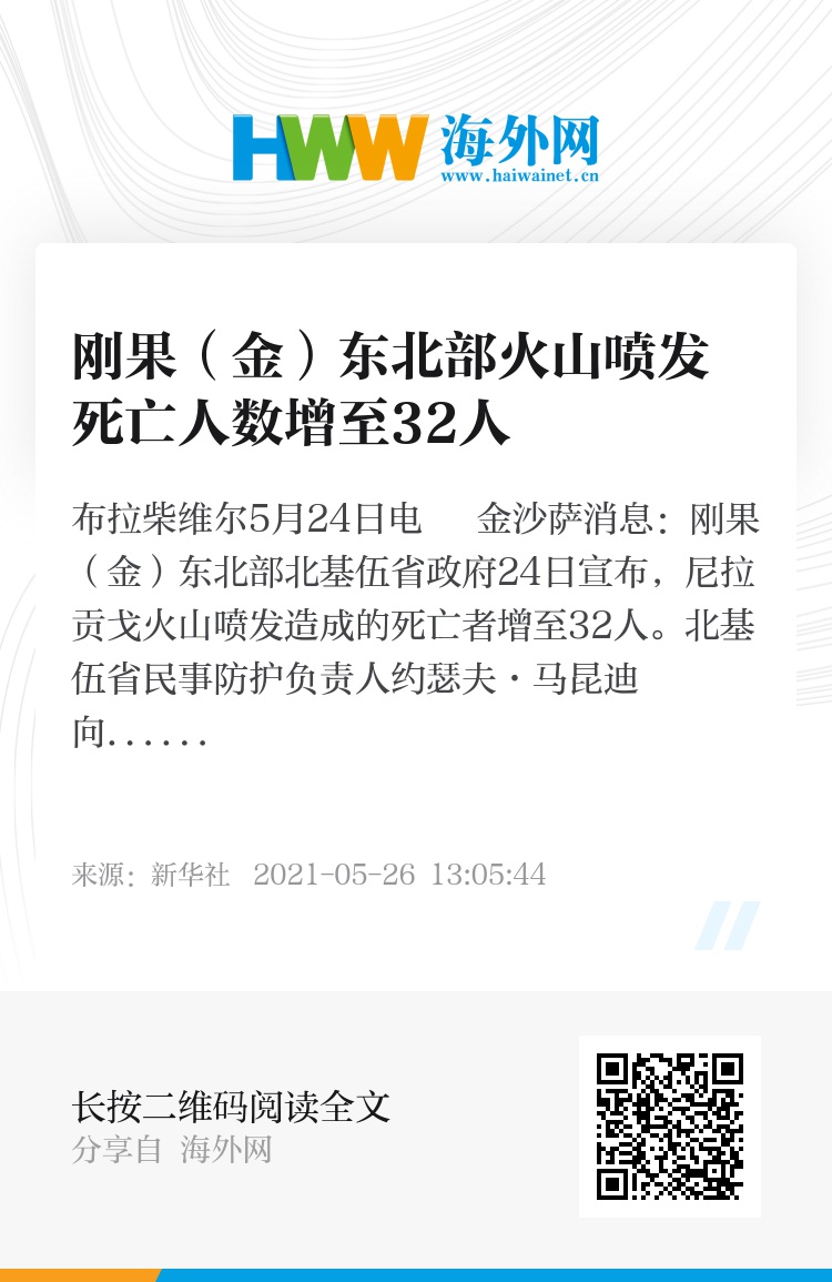 新华社布拉柴维尔5月24日电 金沙萨消息:刚果(金)东北部北基伍省政府24日宣布,尼拉贡戈火山喷发造成的死亡者增至32人。