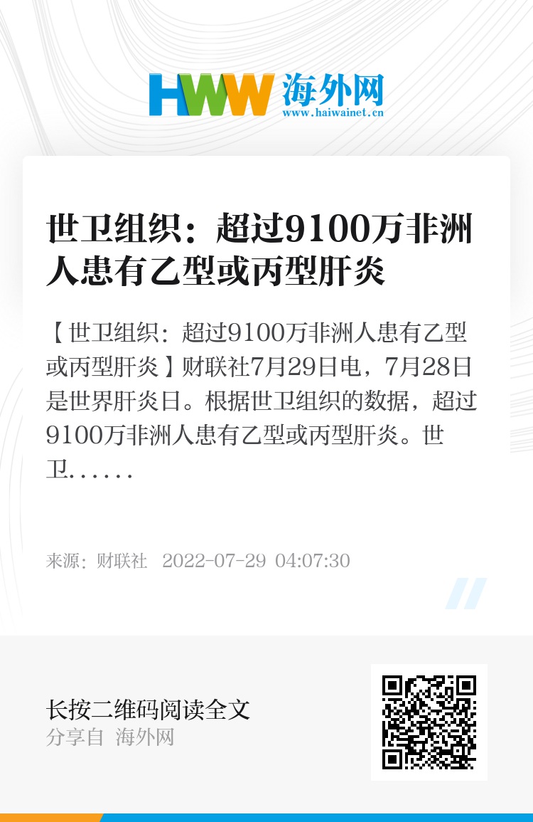 【世卫组织:超过9100万非洲人患有乙型或丙型肝炎】财联社7月29日电,7月28日是世界肝炎日。根据世卫组织的数据,超过9100万非洲人患有乙型或丙型肝炎。世卫组织非洲区域主任穆蒂表示:“有一种安全有效的疫苗可以提供近100%的保护,防止感染乙型肝炎病毒这一最致命的肝炎病毒株之一。我们必须确保所有非洲儿童在出生后24小时内接种疫苗,并随后接种两剂或多剂疫苗。”