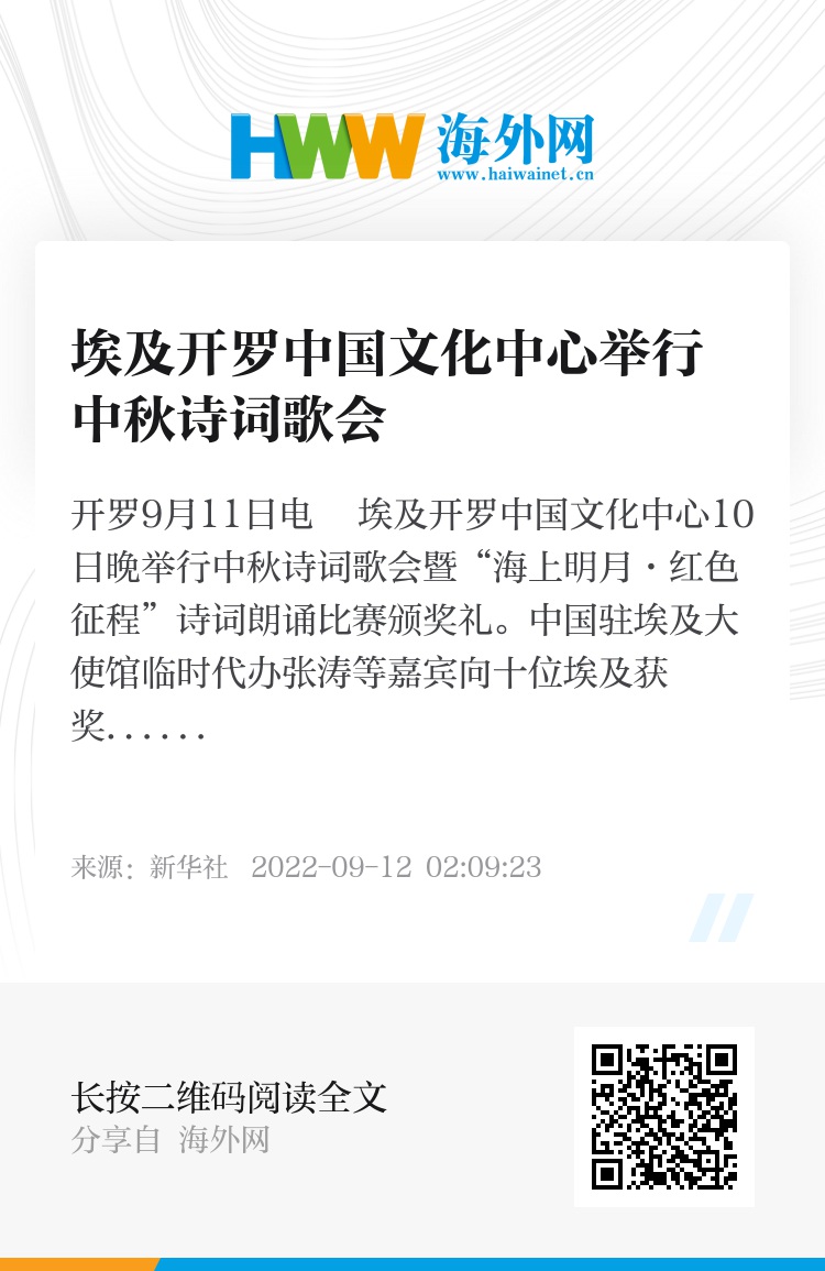 新华社开罗9月11日电 埃及开罗中国文化中心10日晚举行中秋诗词歌会暨“海上明月·红色征程”诗词朗诵比赛颁奖礼。中国驻埃及大使馆临时代办张涛等嘉宾向十位埃及获奖选手颁奖。
