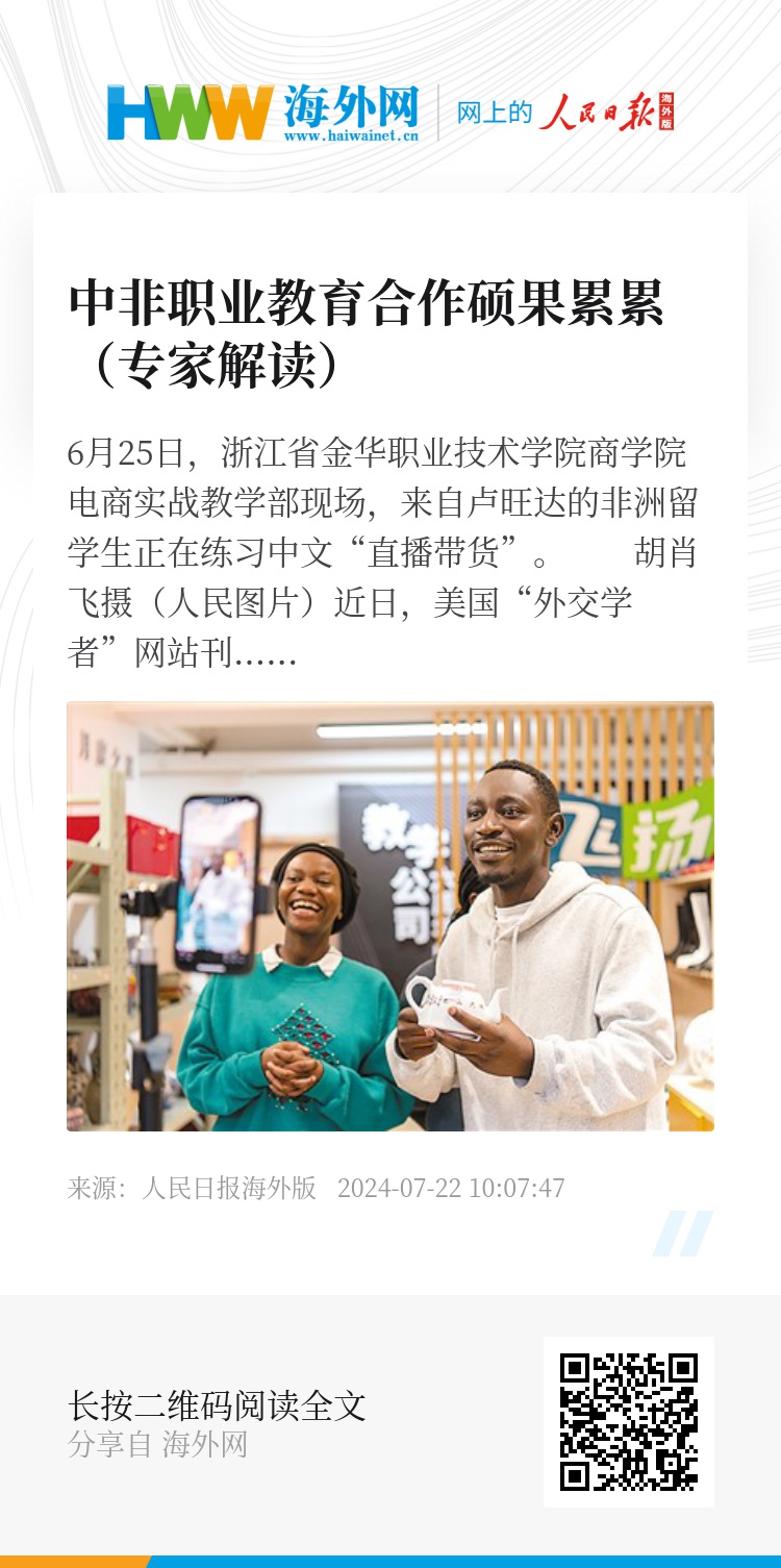 当前,中非都进入新的发展阶段。中国推动构建以国内大循环为主体、国内国际双循环相互促进的新发展格局,将为非洲发展带来更多中国机遇。中非职业教育合作为中国企业在非洲开展投资活动提供了人才支撑。非洲自贸区正式实施、非洲经济一体化和区域经济融合加速推进,为非洲经济发展及中非合作拓展出更大空间。中非职业教育合作也将为非洲的工业化发展提供人才支持,有助于非洲进一步融入全球价值链分工。未来,中非双方将以高质量共建“一带一路”为抓手,进一步推动共建“一带一路”倡议同非盟《2063年议程》、联合国2030年可持续发展议程以及非洲各国发展战略深度对接,深化中非各领域务实合作。在此背景下,中非职业教育合作前景广阔,大有可为。(人民日报海外版记者 李嘉宝采访整理)