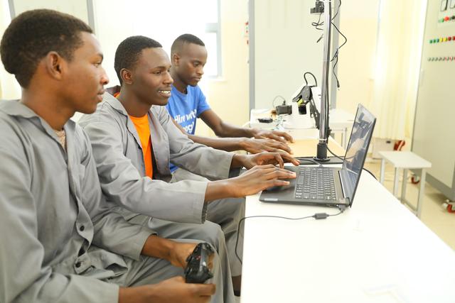4月15日,在卢旺达北方省穆桑泽职业技术学院,学生通过电脑练习操作机械臂。新华社记者吉莉摄