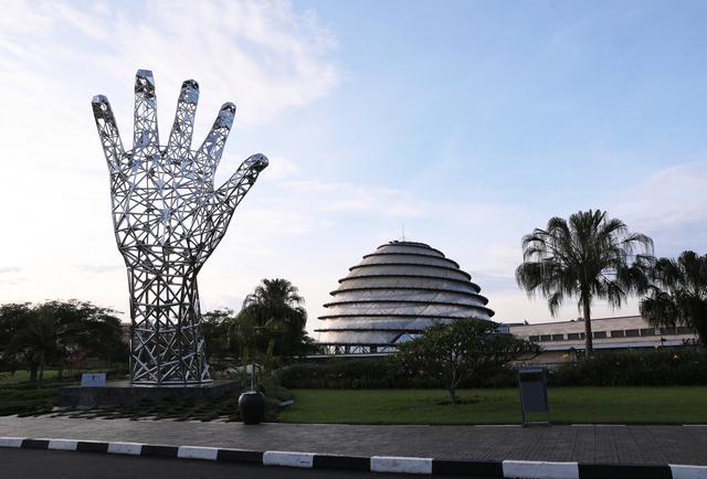 这是4月4日在卢旺达首都基加利拍摄的雕塑(左)及基加利会议中心。新华社记者董江辉摄