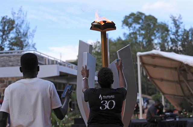 4月8日,在卢旺达首都基加利,参观者伫立在基加利大屠杀纪念馆纪念火炬旁。新华社记者董江辉摄