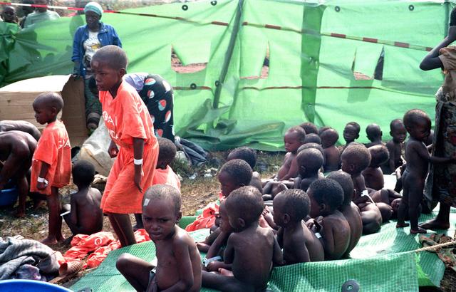 1994年4月6日,卢旺达和布隆迪两国总统在卢首都基加利同机遇难。随后,卢旺达爆发内战,举世震惊。图为在扎伊尔(今刚果民主共和国)与卢旺达边界基奔巴难民营中,卢旺达孤儿们正在等待分发食品。新华社记者刘绍平摄