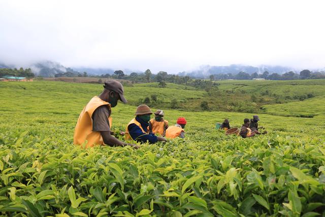 2021年9月18日,几名茶农在卢旺达吉萨库拉的一座茶园里采茶。卢旺达是一个多山的国家,其气候、土壤等条件适合种植茶叶,茶叶成为该国主要出口农产品之一。新华社记者吉莉摄