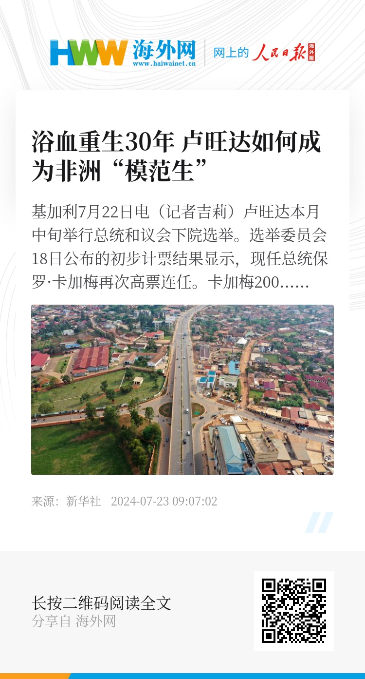 新华社基加利7月22日电(记者吉莉)卢旺达本月中旬举行总统和议会下院选举。选举委员会18日公布的初步计票结果显示,现任总统保罗·卡加梅再次高票连任。卡加梅2000年当政后,颁布一系列改革措施,化解因大屠杀加剧的族群仇恨、重塑国民认同,不断探索适合本国国情的发展道路。卢旺达经济增长迅速,取得显著的发展成就,被誉为非洲“模范生”。