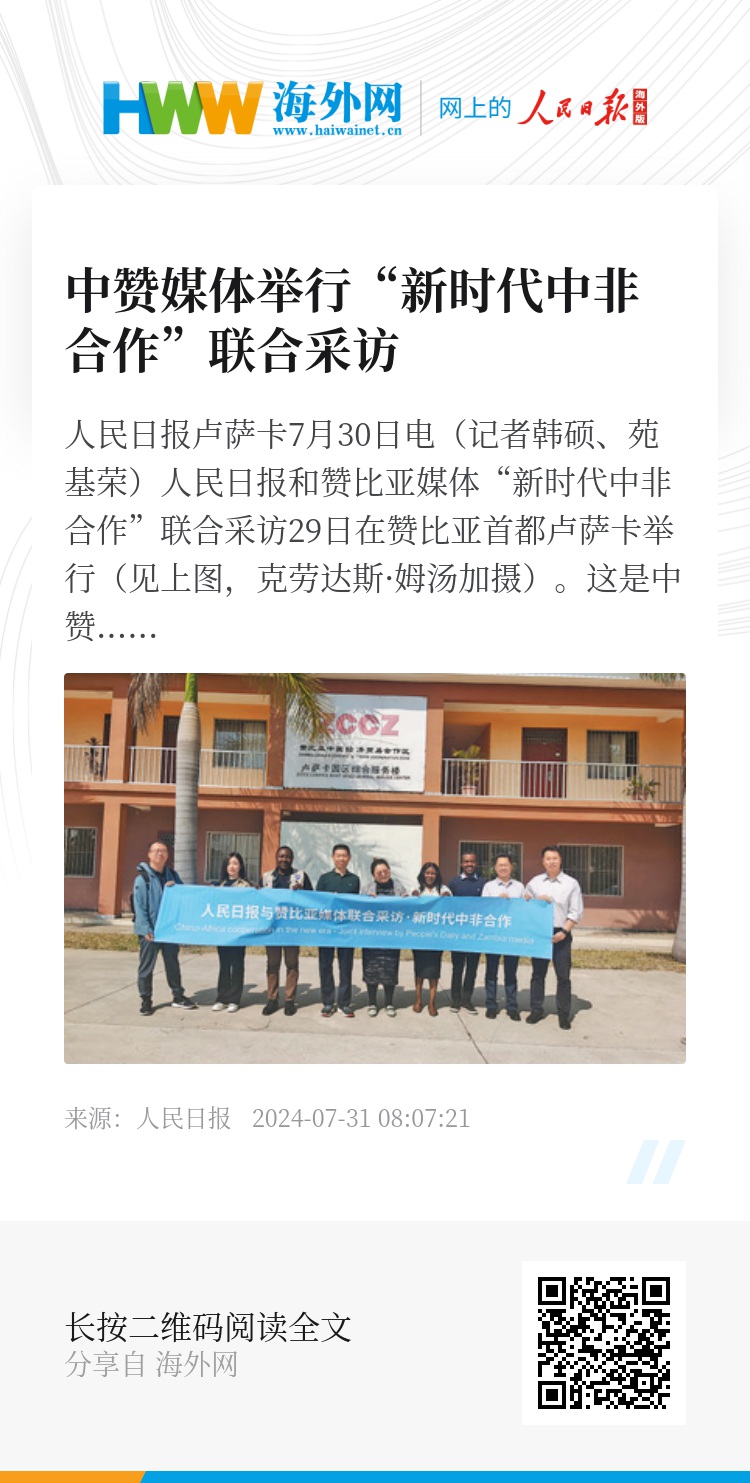 人民日报卢萨卡7月30日电(记者韩硕、苑基荣)人民日报和赞比亚媒体“新时代中非合作”联合采访29日在赞比亚首都卢萨卡举行(见上图,克劳达斯·姆汤加摄)。这是中赞两国媒体首次在赞进行“新时代中非合作”联合采访。