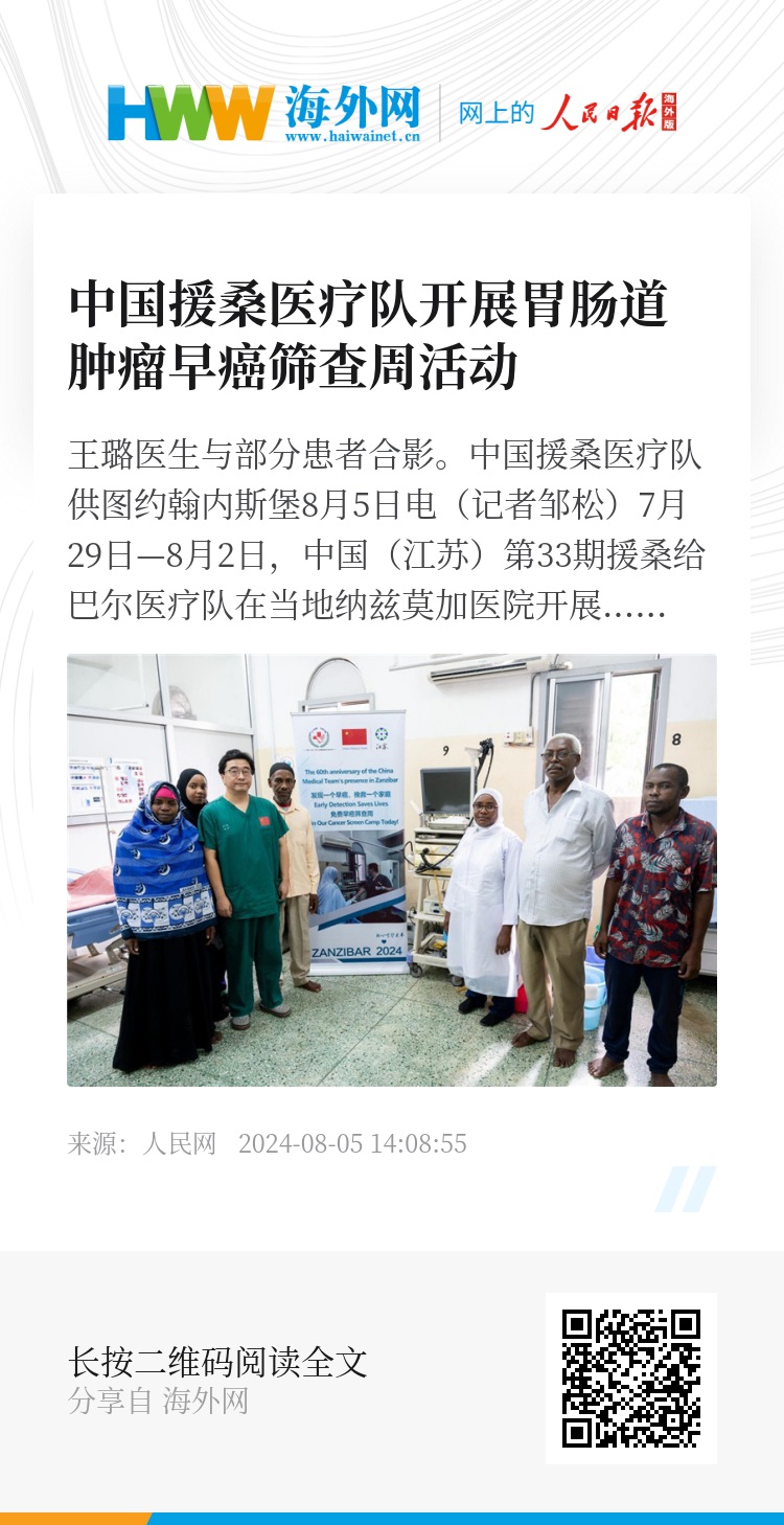 人民网约翰内斯堡8月5日电(记者邹松)7月29日—8月2日,中国(江苏)第33期援桑给巴尔医疗队在当地纳兹莫加医院开展了为期一周的胃肠道肿瘤早癌筛查周活动。