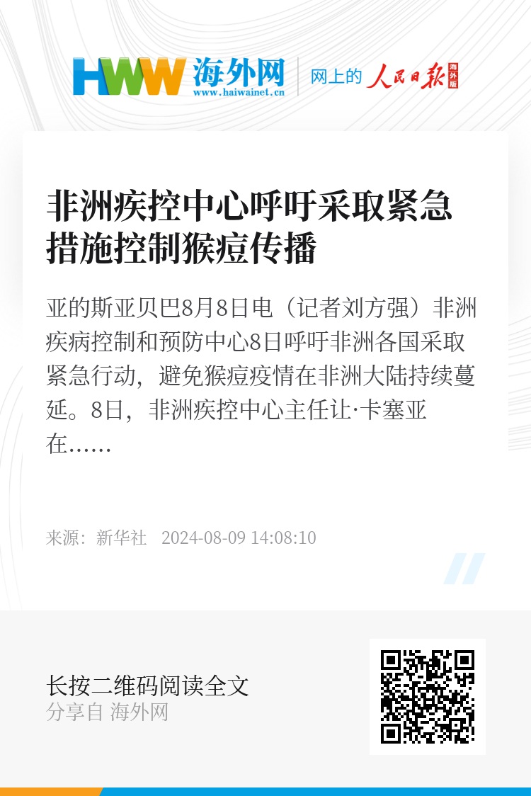 新华社亚的斯亚贝巴8月8日电(记者刘方强)非洲疾病控制和预防中心8日呼吁非洲各国采取紧急行动,避免猴痘疫情在非洲大陆持续蔓延。