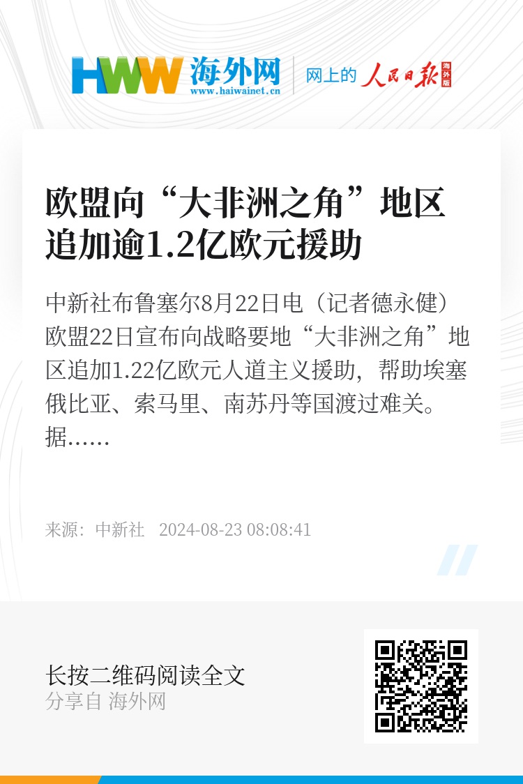 中新社布鲁塞尔8月22日电(记者德永健)欧盟22日宣布向战略要地“大非洲之角”地区追加1.22亿欧元人道主义援助,帮助埃塞俄比亚、索马里、南苏丹等国渡过难关。