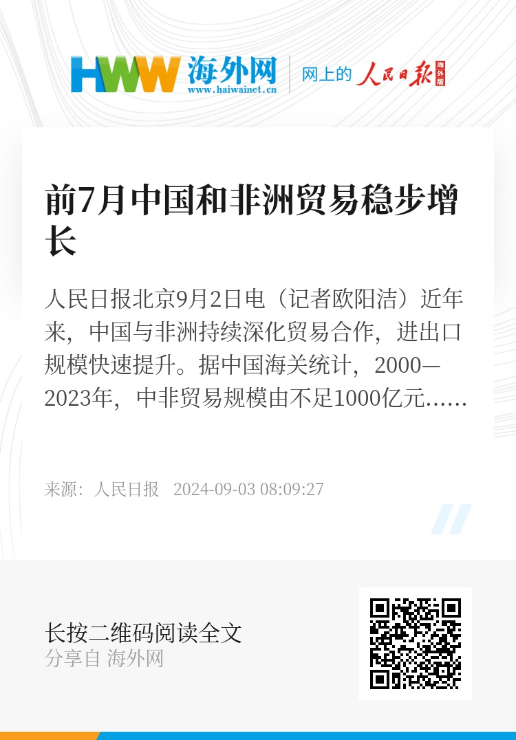 人民日报北京9月2日电(记者欧阳洁)近年来,中国与非洲持续深化贸易合作,进出口规模快速提升。据中国海关统计,2000—2023年,中非贸易规模由不足1000亿元增长至1.98万亿元,年均增长17.2%,高于同期中国整体货物贸易年均增速4.6个百分点。2023年,“中国—非洲贸易指数”首次突破1000点,达到1010.83,比2022年上升20.28点,呈现良好发展态势。今年前7个月,中国对非洲进出口1.19万亿元,增长5.5%,规模创历史同期新高。
