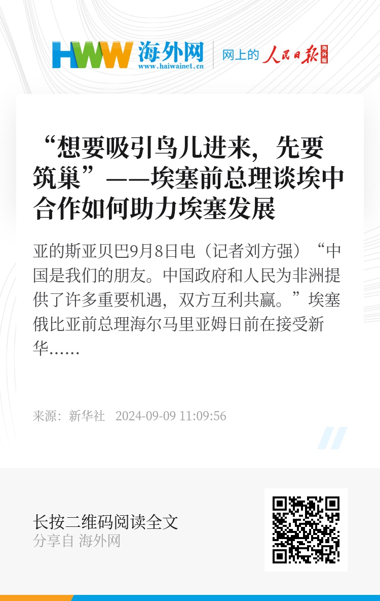 海尔马里亚姆认为,从基础设施建设到人才培养,从工业园区发展到经贸投资,埃塞与中国合作对埃塞经济社会发展起到积极作用。