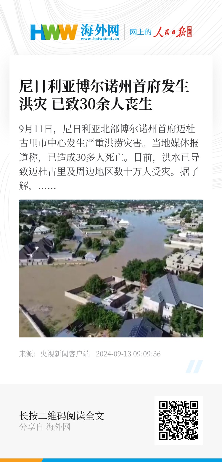 9月11日,尼日利亚北部博尔诺州首府迈杜古里市中心发生严重洪涝灾害。当地媒体报道称,已造成30多人死亡。