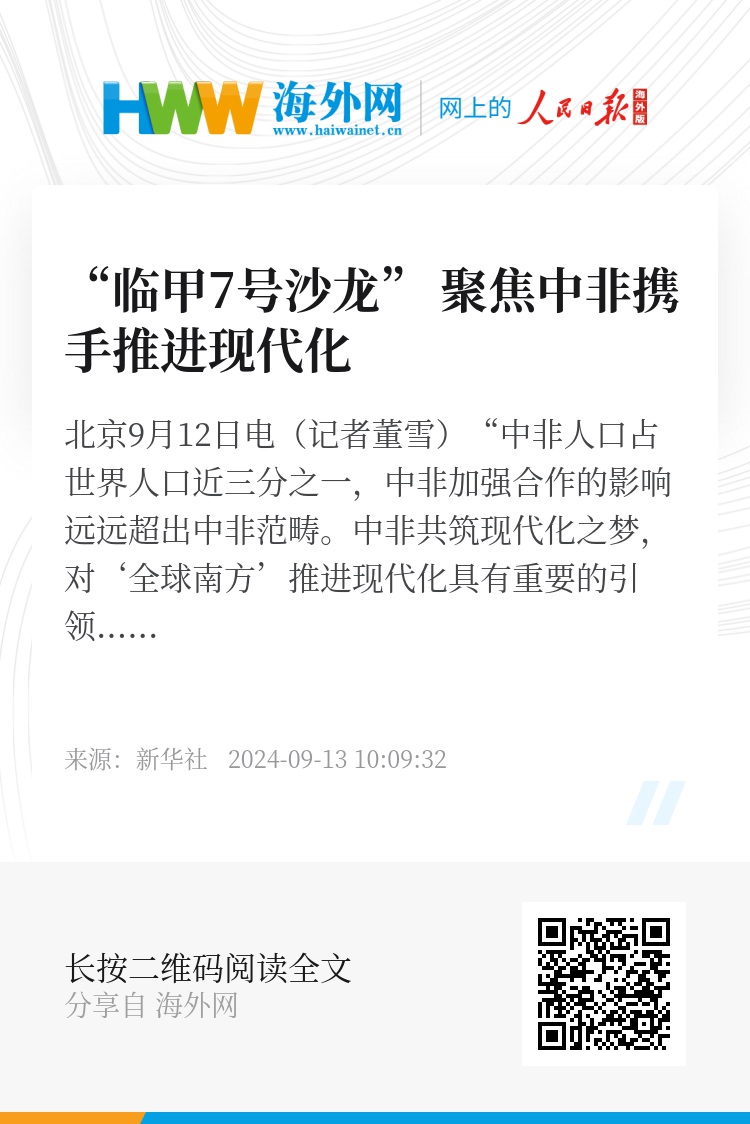 新华社北京9月12日电(记者董雪)“中非人口占世界人口近三分之一,中非加强合作的影响远远超出中非范畴。中非共筑现代化之梦,对‘全球南方’推进现代化具有重要的引领作用。”中国公共外交协会王东华大使12日在最新一期“临甲7号沙龙”专题交流会上表示。