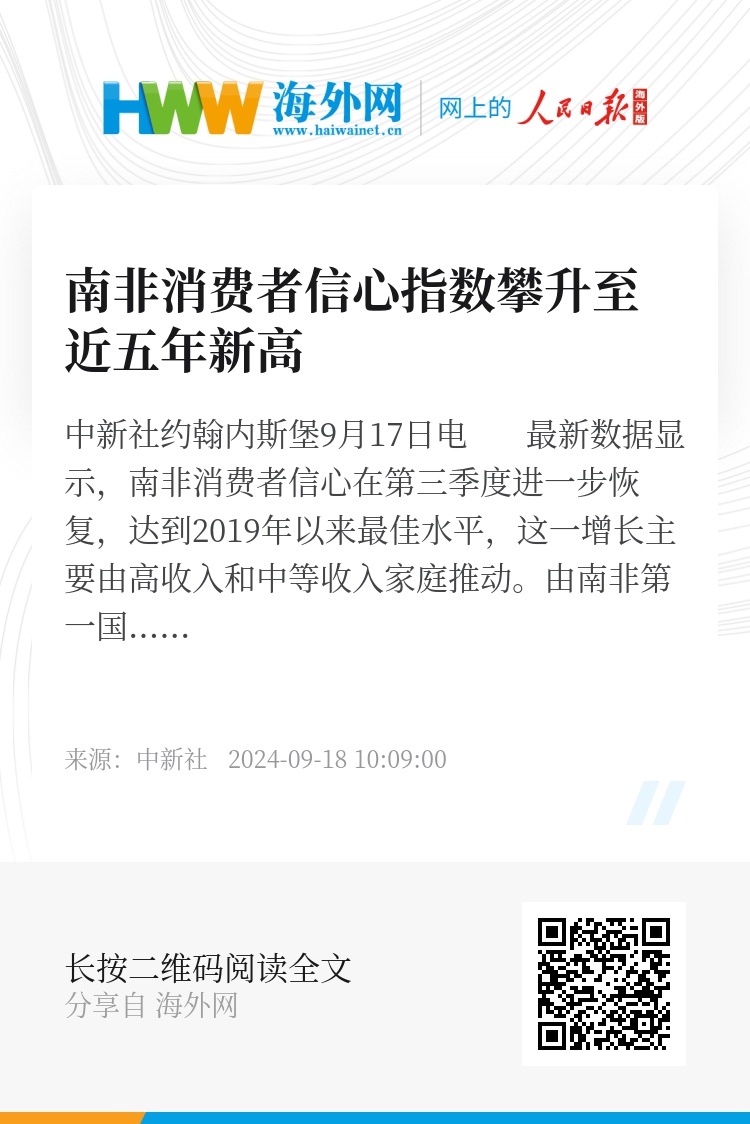 中新社约翰内斯堡9月17日电 最新数据显示,南非消费者信心在第三季度进一步恢复,达到2019年以来最佳水平,这一增长主要由高收入和中等收入家庭推动。