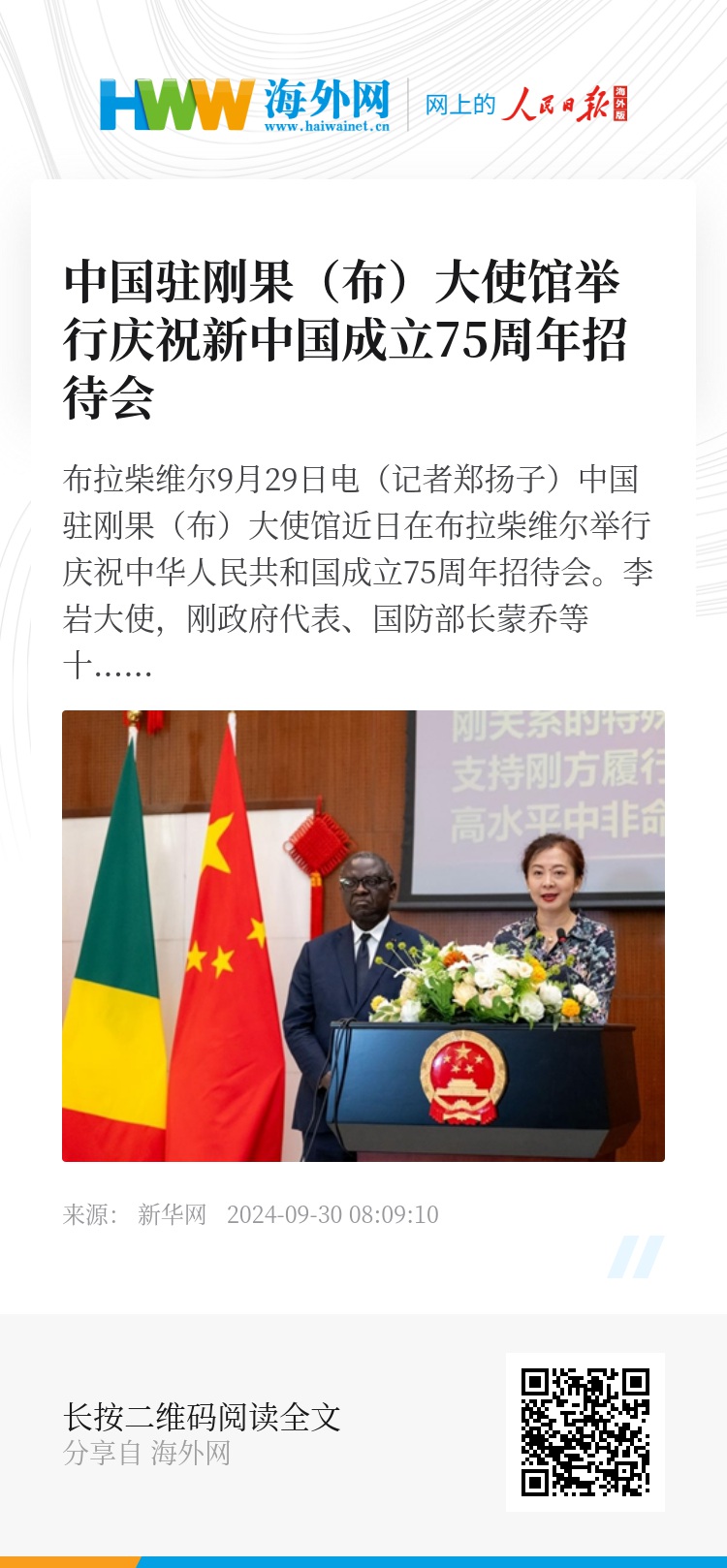 新华网布拉柴维尔9月29日电(记者郑扬子)中国驻刚果(布)大使馆近日在布拉柴维尔举行庆祝中华人民共和国成立75周年招待会。