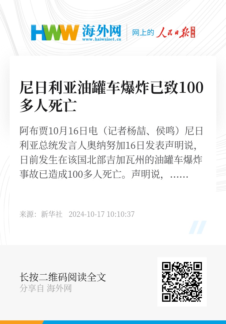 新华社阿布贾10月16日电(记者杨喆、侯鸣)尼日利亚总统发言人奥纳努加16日发表声明说,日前发生在该国北部吉加瓦州的油罐车爆炸事故已造成100多人死亡。