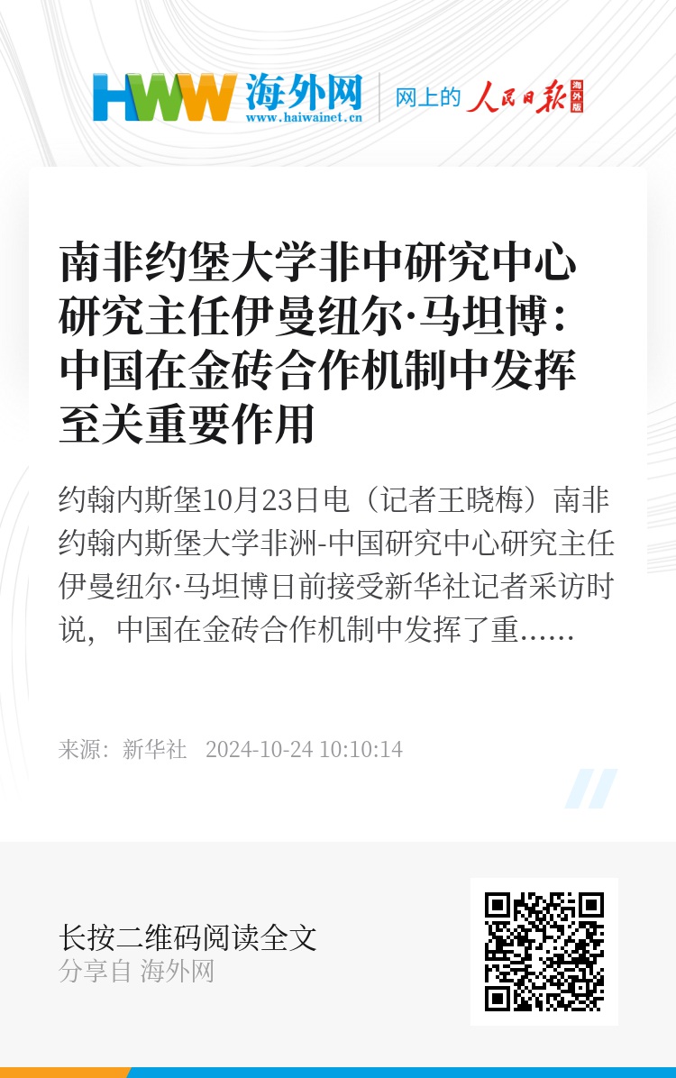 新华社约翰内斯堡10月23日电(记者王晓梅)南非约翰内斯堡大学非洲-中国研究中心研究主任伊曼纽尔·马坦博日前接受新华社记者采访时说,中国在金砖合作机制中发挥了重要作用,并将继续引领推动这一机制发展壮大。