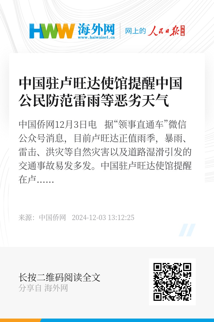 中国侨网12月3日电 据“领事直通车”微信公众号消息,目前卢旺达正值雨季,暴雨、雷击、洪灾等自然灾害以及道路湿滑引发的交通事故易发多发。