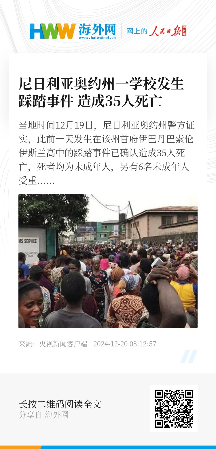 当地时间12月19日,尼日利亚奥约州警方证实,此前一天发生在该州首府伊巴丹巴索伦伊斯兰高中的踩踏事件已确认造成35人死亡,死者均为未成年人,另有6名未成年人受重伤。