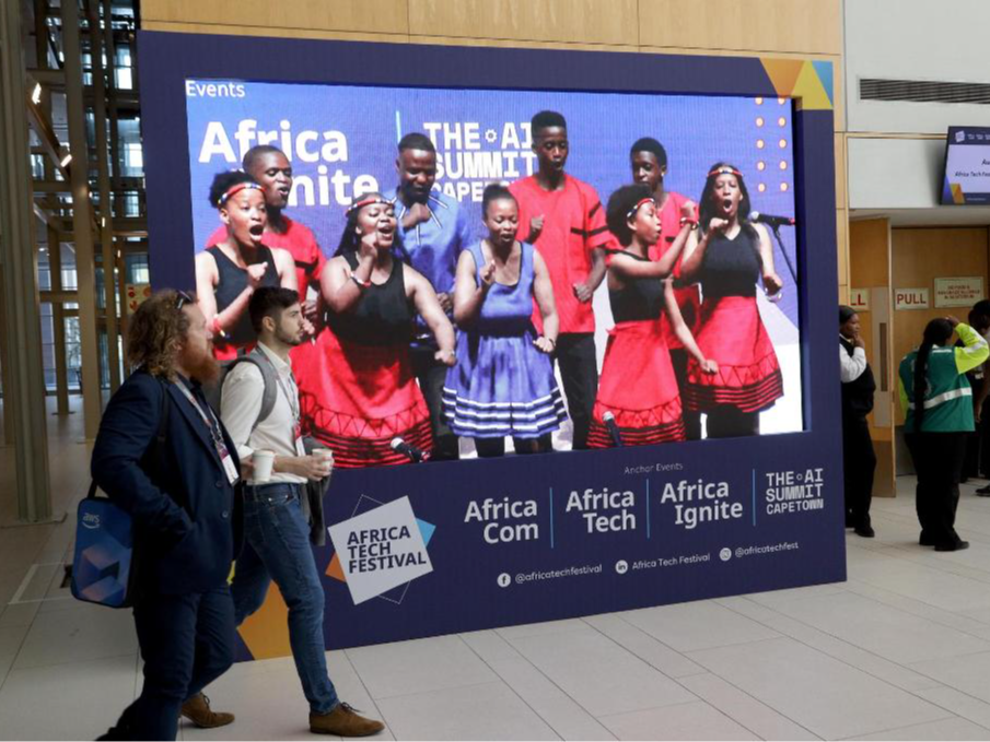 11月12日,人们走在南非开普敦非洲科技节活动现场。第27届非洲科技节12日在南非开普敦国际会议中心拉开帷幕,全球科技和通信行业人士汇聚一堂,聚焦非洲数字化转型和创新。新华社发(弗雷德·巴克摄)