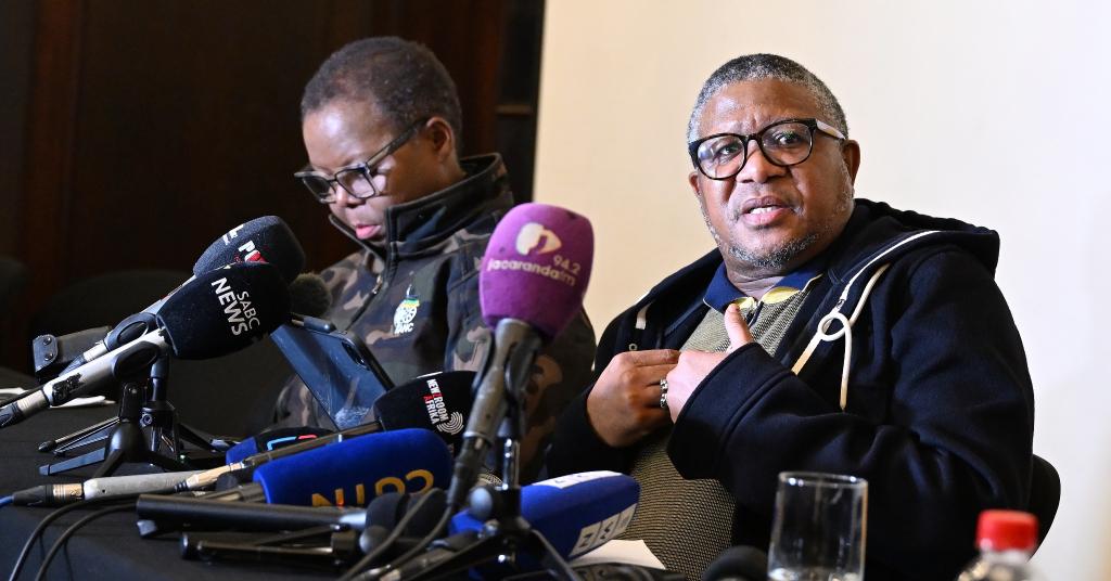 6月13日,在南非开普敦,南非执政党非洲人国民大会(非国大)秘书长姆巴卢拉(右)在非国大全国执行委员会会议后的新闻发布会上讲话。姆巴卢拉表示,非国大与多个政党就组建民族团结政府进行的协商取得突破。新华社发(哈比索·姆卡贝拉摄)
