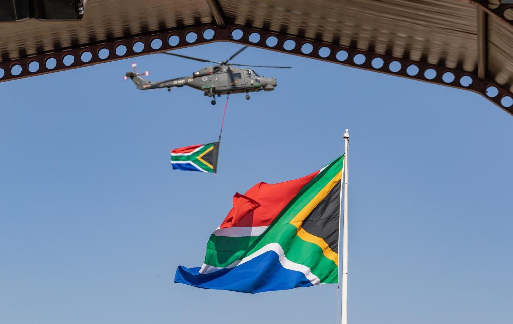 6月19日,在南非比勒陀利亚,直升机在南非新任总统就职仪式上飞过。新华社记者张誉东摄