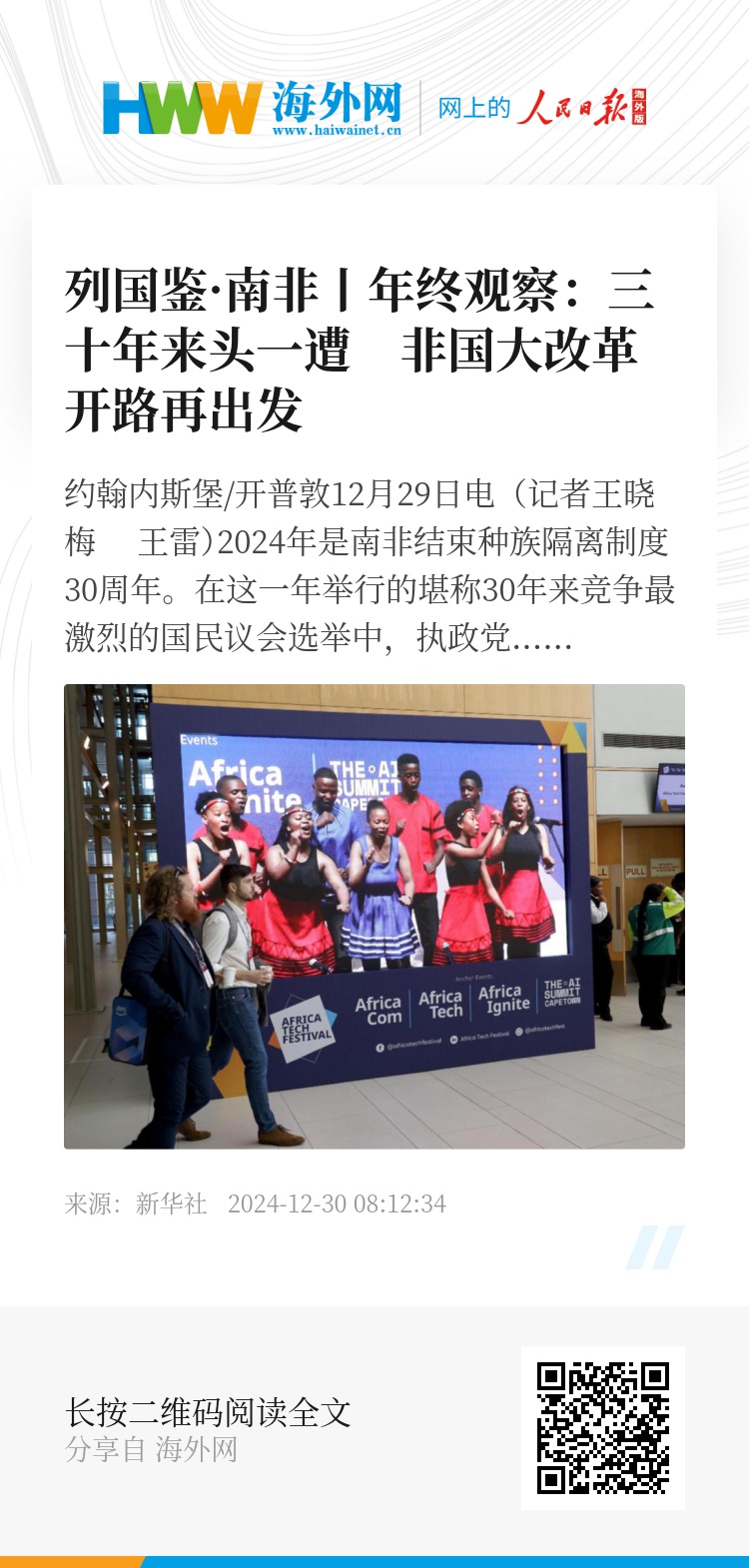 新华社约翰内斯堡/开普敦12月29日电(记者王晓梅 王雷)2024年是南非结束种族隔离制度30周年。在这一年举行的堪称30年来竞争最激烈的国民议会选举中,执政党非洲人国民大会(非国大)仅获约4成选票,执政30年来首次未能单独获得议会多数席位,被迫与其他政党联合组建政府。