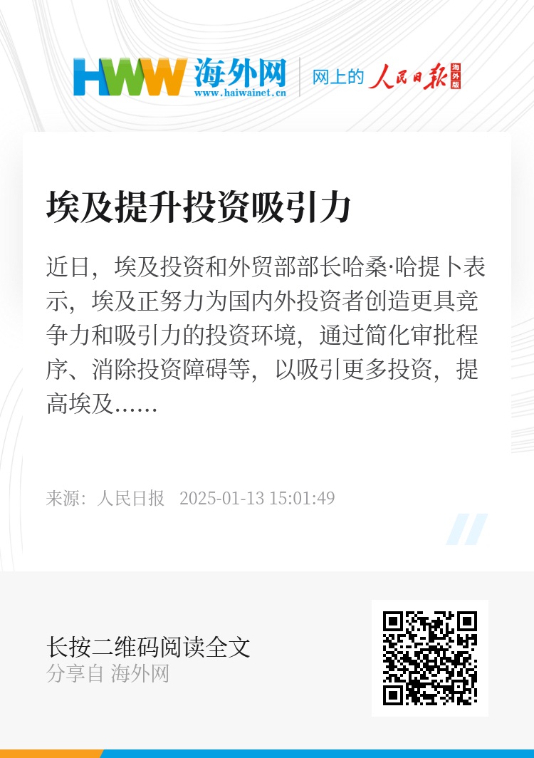 近日,埃及投资和外贸部部长哈桑·哈提卜表示,埃及正努力为国内外投资者创造更具竞争力和吸引力的投资环境,通过简化审批程序、消除投资障碍等,以吸引更多投资,提高埃及的国际竞争力。根据联合国贸易和发展会议相关报告,埃及已连续两年成为非洲第一大投资目的地,2023年埃及吸引外国直接投资额占非洲吸引外国直接投资总额的18.6%,居非洲国家之首。