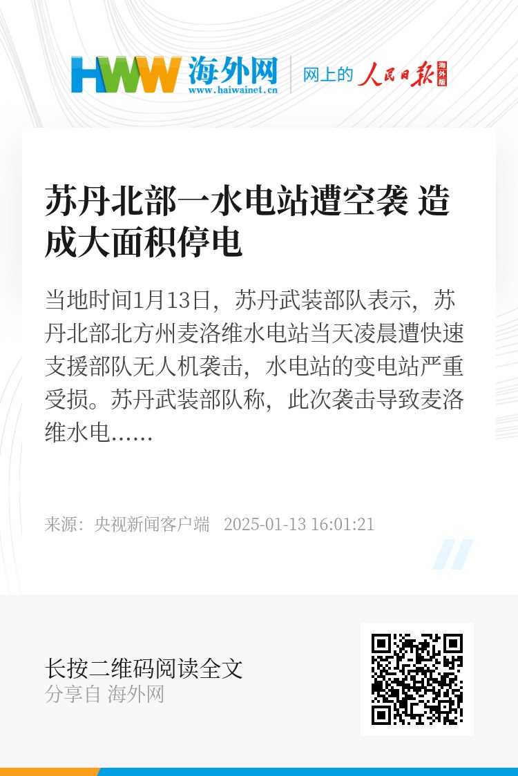 当地时间1月13日,苏丹武装部队表示,苏丹北部北方州麦洛维水电站当天凌晨遭快速支援部队无人机袭击,水电站的变电站严重受损。