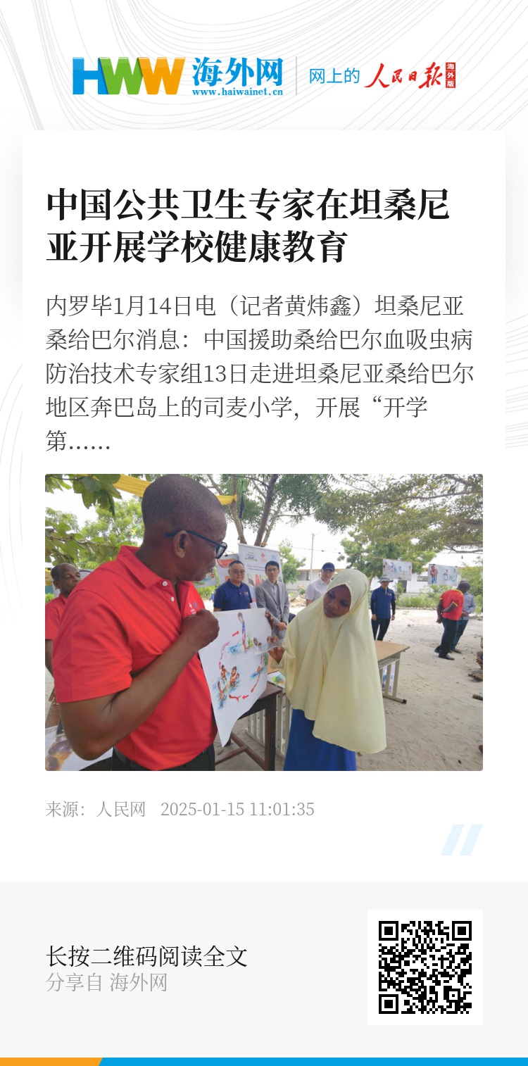 人民网内罗毕1月14日电(记者黄炜鑫)坦桑尼亚桑给巴尔消息:中国援助桑给巴尔血吸虫病防治技术专家组13日走进坦桑尼亚桑给巴尔地区奔巴岛上的司麦小学,开展“开学第一课,血防进校园”健康教育。中国驻桑给巴尔总领事李强华参加活动。