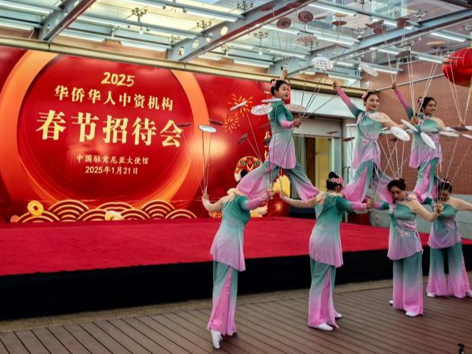 招待会现场设置了书法、剪纸、年画等多个传统文化体验展台,在场嘉宾纷纷拿起画笔,画下了熊猫、“柿柿如意”等富含中国文化意涵的年画。来自河南的艺术团队展示了传统戏剧、少林功夫、手工泥塑等民俗表演,为现场增添了喜气洋洋的节日氛围。(总台记者 赵倩)