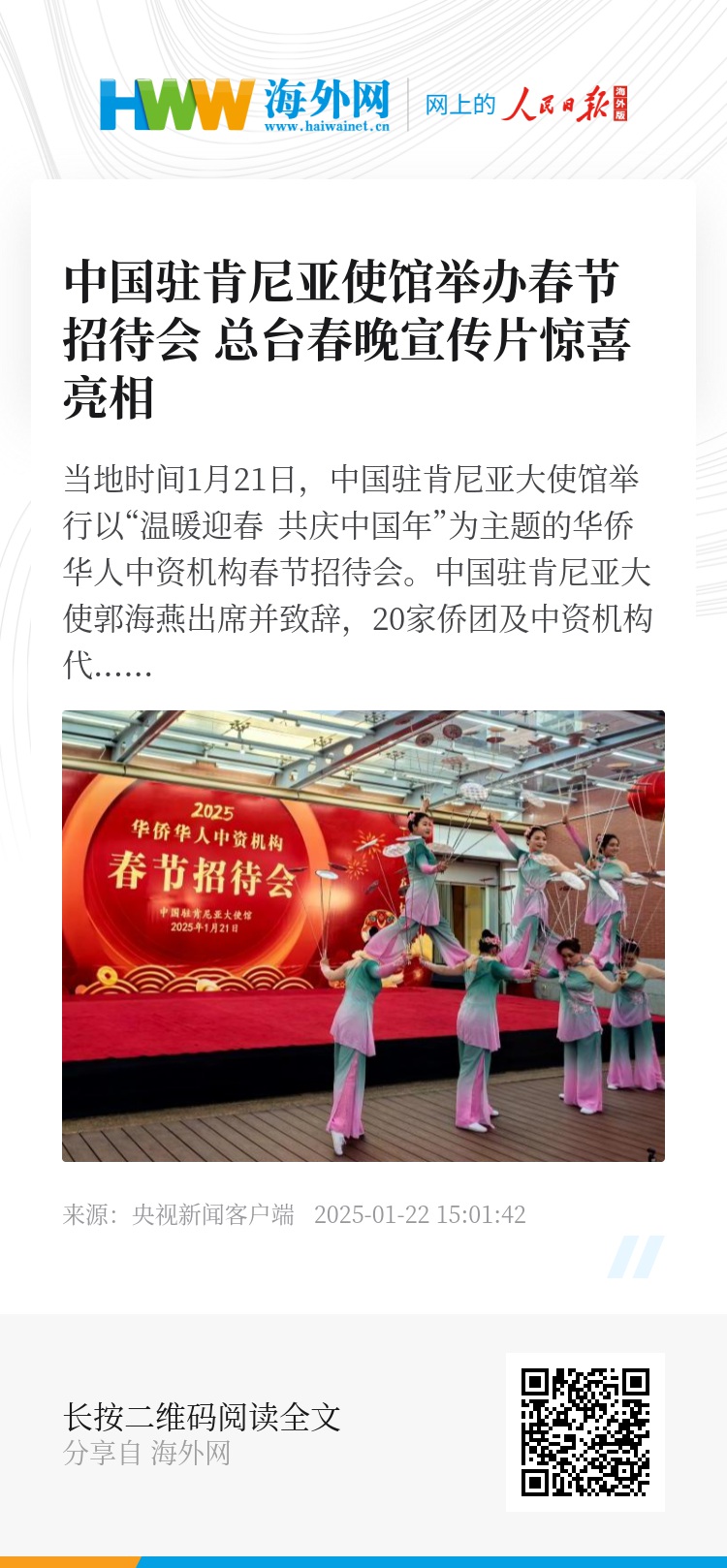 当地时间1月21日,中国驻肯尼亚大使馆举行以“温暖迎春 共庆中国年”为主题的华侨华人中资机构春节招待会。中国驻肯尼亚大使郭海燕出席并致辞,20家侨团及中资机构代表、联合国内罗毕办事处中国职员、驻肯央媒、孔子学院等300人出席。中肯各界嘉宾欢聚一堂,共迎乙巳蛇年春节。