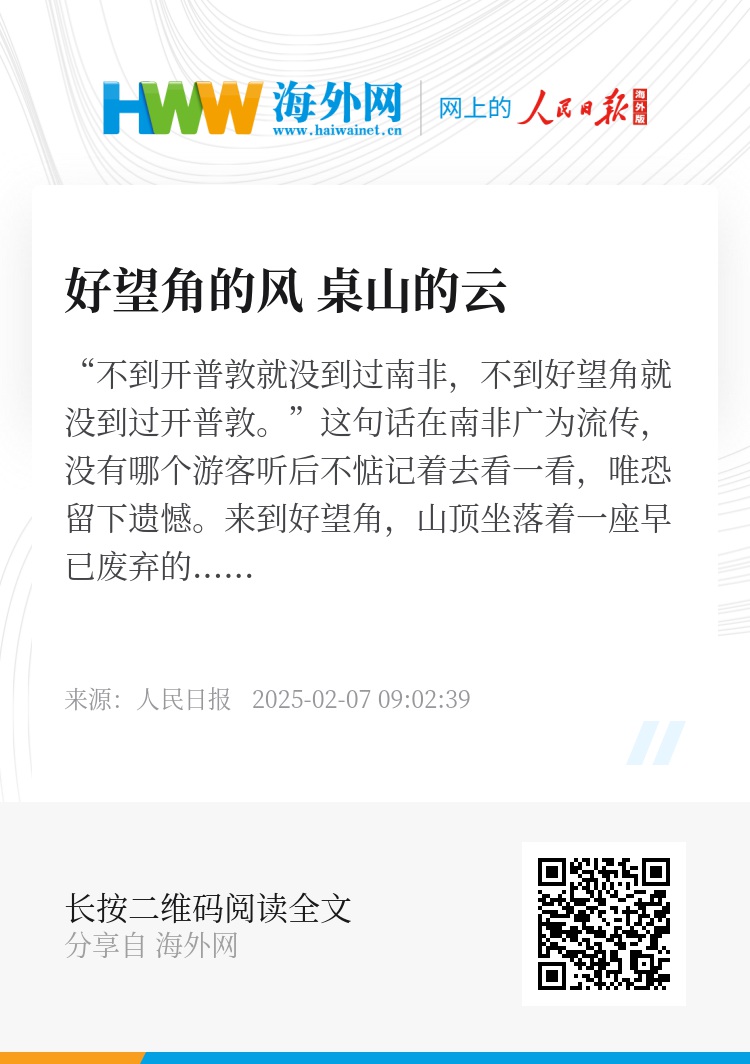 桌山的云,与好望角的风异曲同工,都是大自然的神奇手笔。距好望角约50公里的桌山是“大自然的餐桌”。庞大的山体,顶部被“一刀切”,远远望去,异常平坦。即使是晴空万里的日子,山顶也常年笼罩着一层厚厚的云雾,这层云雾被当地人称为桌山的“桌布”。