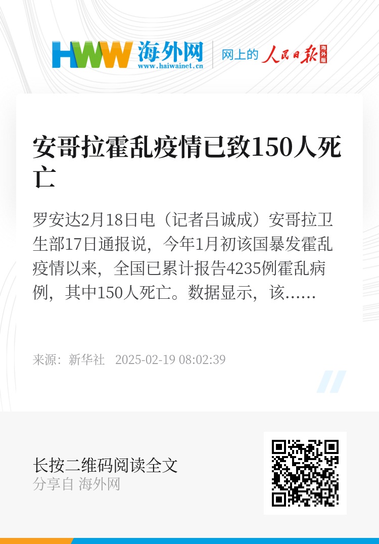 新华社罗安达2月18日电(记者吕诚成)安哥拉卫生部17日通报说,今年1月初该国暴发霍乱疫情以来,全国已累计报告4235例霍乱病例,其中150人死亡。