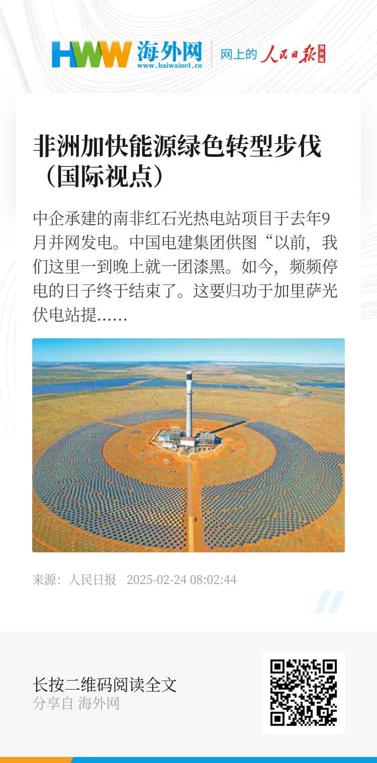 从肯尼亚的加里萨光伏电站到南非的德阿风电项目,中国近年来在非洲实施的清洁能源和绿色发展项目已达数百个,中方通过技术转让、项目合作和金融支持,推动中非绿色能源合作不断深入。