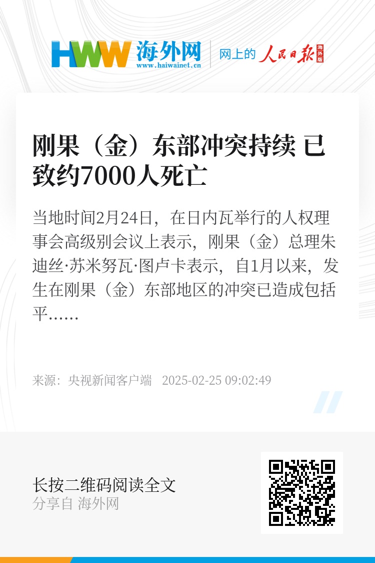当地时间2月24日,在日内瓦举行的人权理事会高级别会议上表示,刚果(金)总理朱迪丝·苏米努瓦·图卢卡表示,自1月以来,发生在刚果(金)东部地区的冲突已造成包括平民在内的约7000人死亡。戈马约有3000人死亡,90个流离失所者营地被毁。