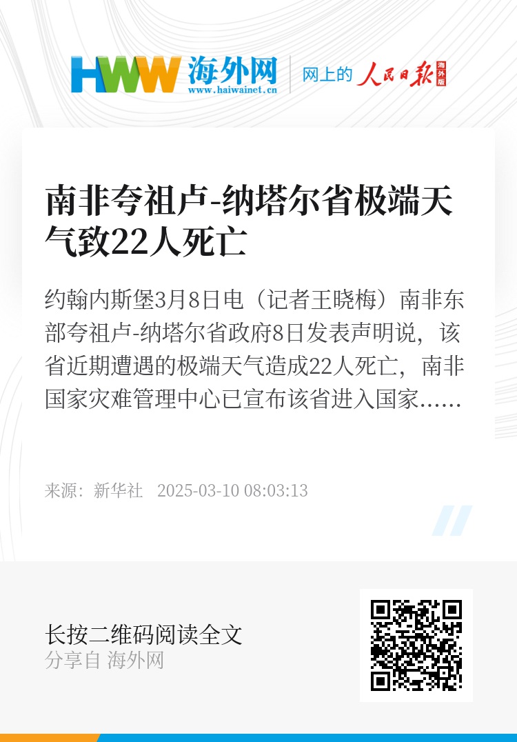 新华社约翰内斯堡3月8日电(记者王晓梅)南非东部夸祖卢-纳塔尔省政府8日发表声明说,该省近期遭遇的极端天气造成22人死亡,南非国家灾难管理中心已宣布该省进入国家灾难状态。