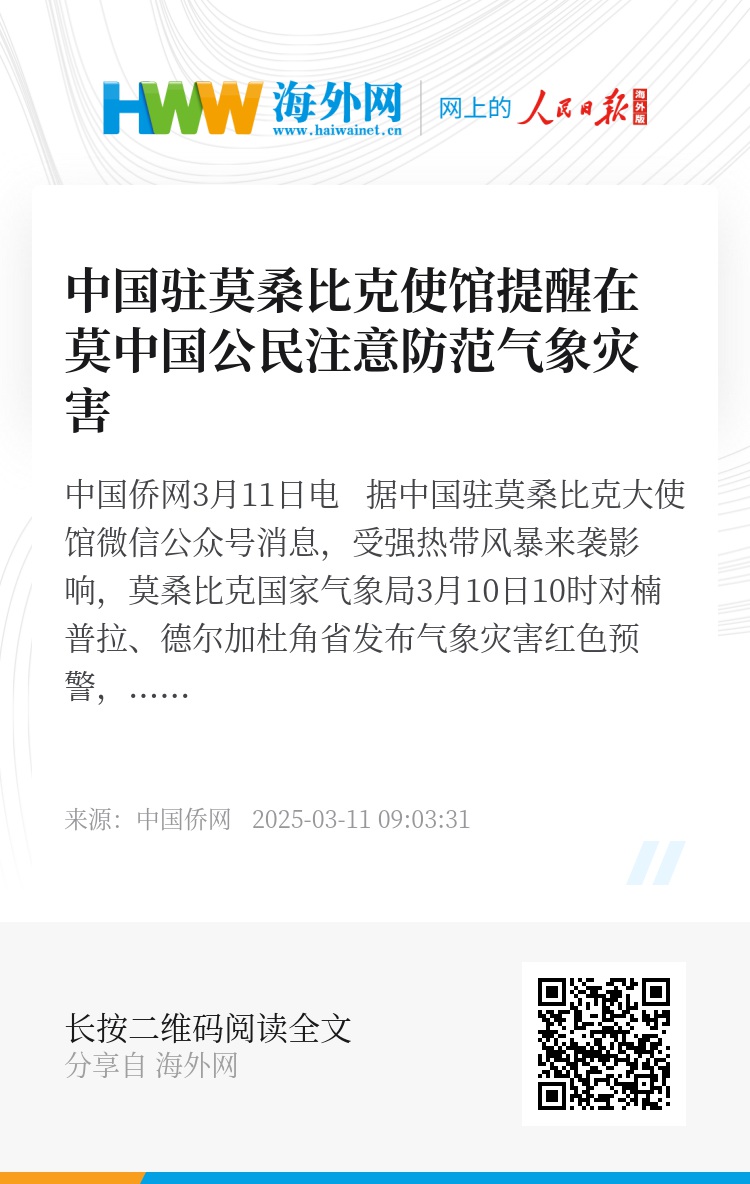 当前莫仍处雨季,天气多变。驻莫桑比克使馆提醒在莫中国公民和机构加强安全防范,远离低洼地带,同时做好防灾减灾工作,制定通讯中断、紧急撤离等极端情况应急预案。请广大在莫侨胞提高自我保护意识,密切关注当地天气和水文变化情况,谨慎、安全出行,避免人身和财产损失。如遇紧急情况,请及时报警并与驻莫桑比克大使馆联系寻求帮助。