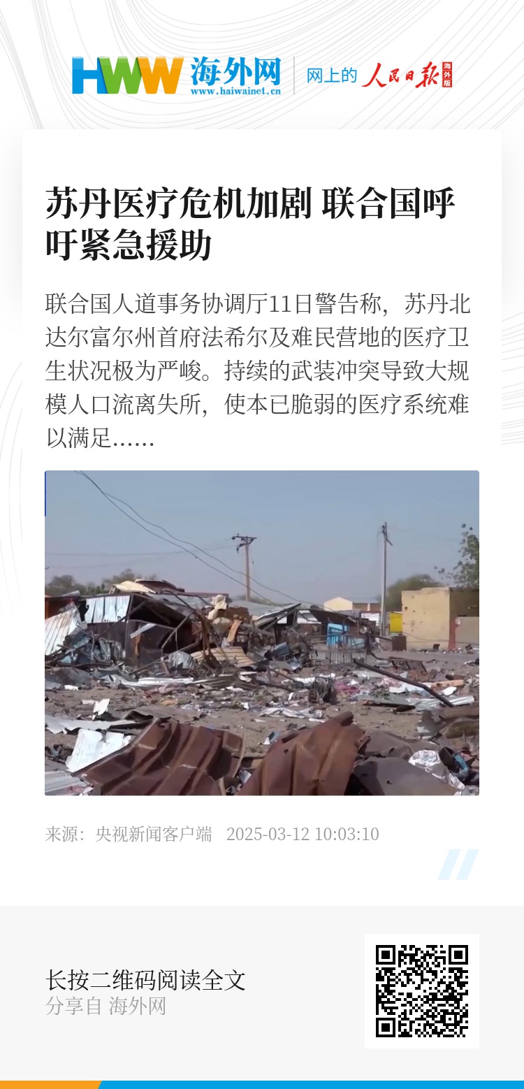 联合国人道事务协调厅11日警告称,苏丹北达尔富尔州首府法希尔及难民营地的医疗卫生状况极为严峻。持续的武装冲突导致大规模人口流离失所,使本已脆弱的医疗系统难以满足基本医疗需求。