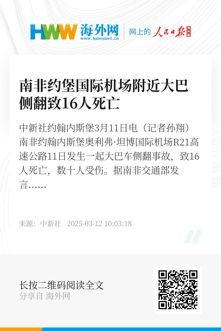 中新社约翰内斯堡3月11日电(记者孙翔)南非约翰内斯堡奥利弗·坦博国际机场R21高速公路11日发生一起大巴车侧翻事故,致16人死亡,数十人受伤。