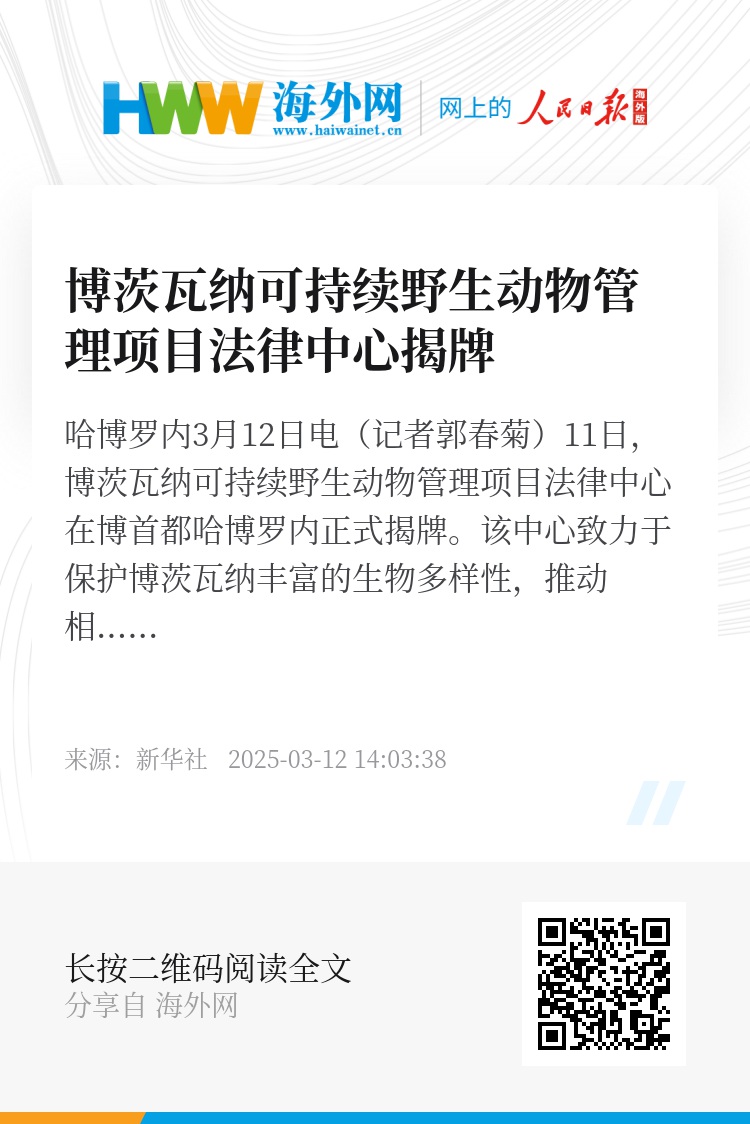 新华社哈博罗内3月12日电(记者郭春菊)11日,博茨瓦纳可持续野生动物管理项目法律中心在博首都哈博罗内正式揭牌。该中心致力于保护博茨瓦纳丰富的生物多样性,推动相关资源的可持续利用,从而造福当地社区。