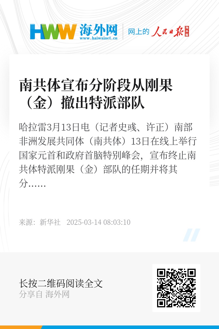 新华社哈拉雷3月13日电(记者史彧、许正)南部非洲发展共同体(南共体)13日在线上举行国家元首和政府首脑特别峰会,宣布终止南共体特派刚果(金)部队的任期并将其分阶段撤出。