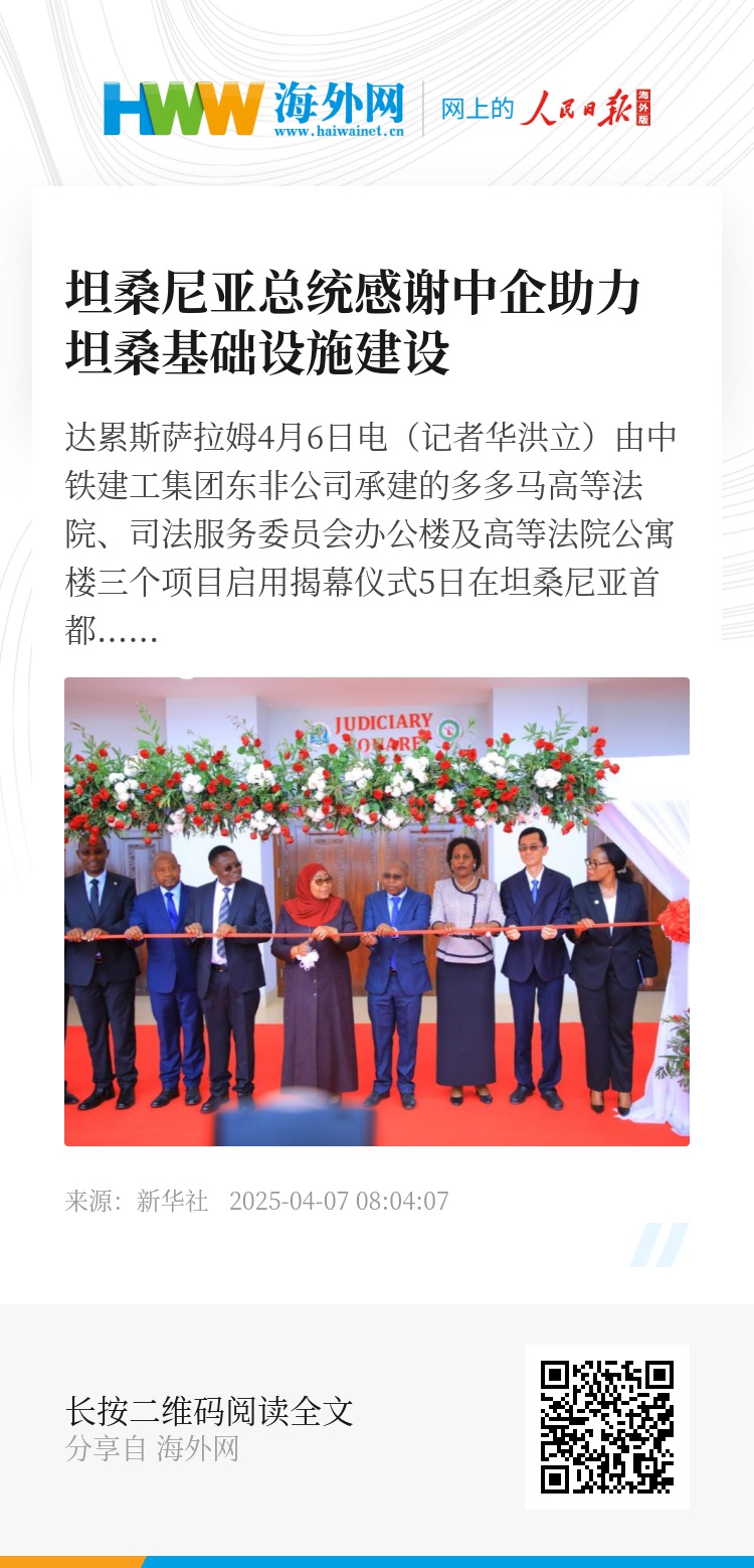 新华社达累斯萨拉姆4月6日电(记者华洪立)由中铁建工集团东非公司承建的多多马高等法院、司法服务委员会办公楼及高等法院公寓楼三个项目启用揭幕仪式5日在坦桑尼亚首都多多马举行。