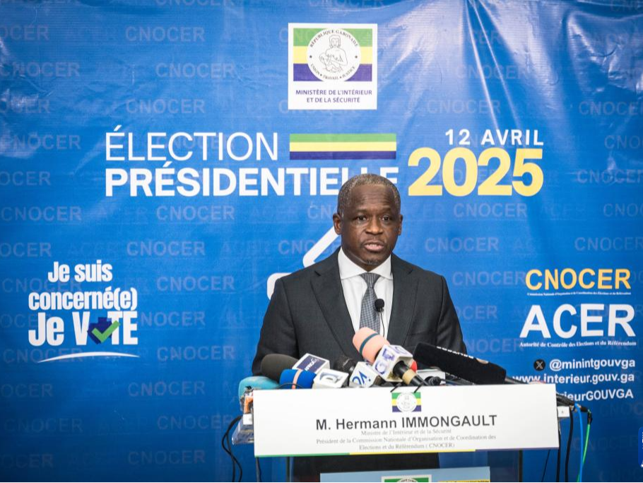 4月13日,加蓬内政和安全部长埃尔曼·伊蒙戈在加蓬利伯维尔的新闻发布会上讲话。新华社记者 王冠森 摄