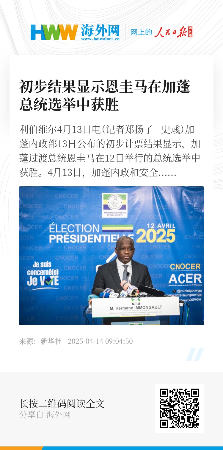 新华社利伯维尔4月13日电(记者郑扬子 史彧)加蓬内政部13日公布的初步计票结果显示,加蓬过渡总统恩圭马在12日举行的总统选举中获胜。