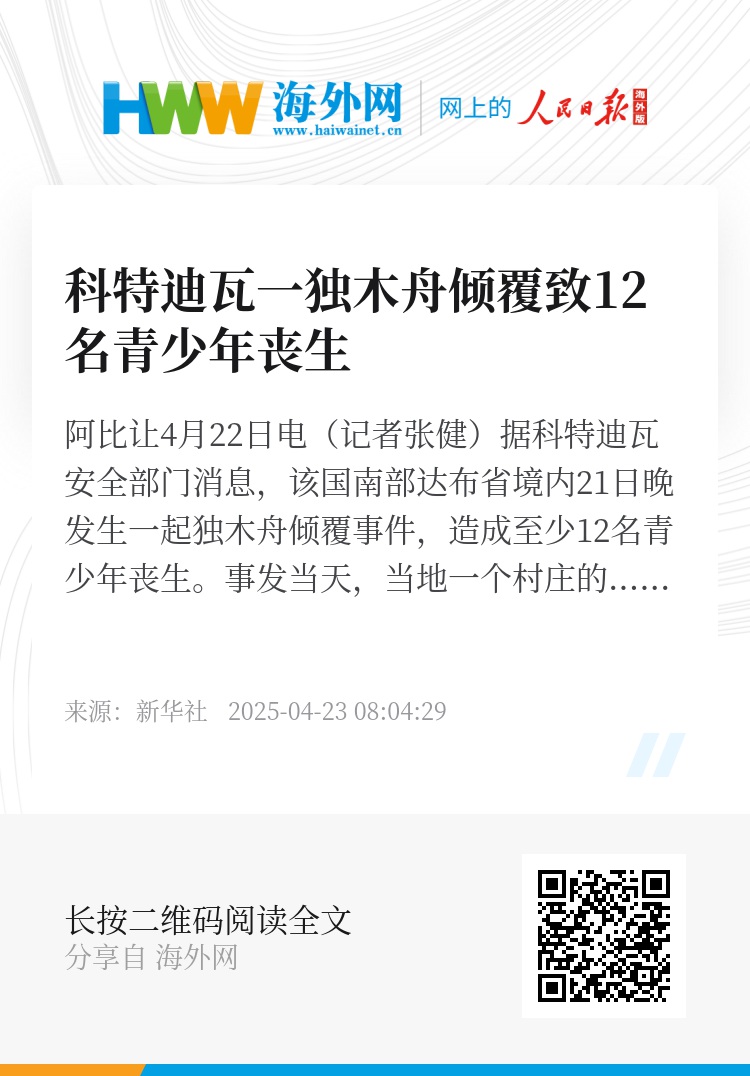 新华社阿比让4月22日电(记者张健)据科特迪瓦安全部门消息,该国南部达布省境内21日晚发生一起独木舟倾覆事件,造成至少12名青少年丧生。