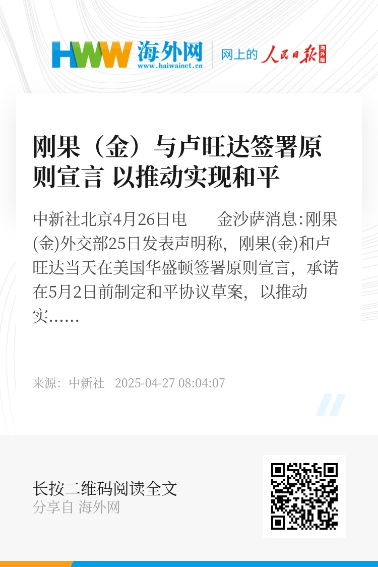 中新社北京4月26日电 金沙萨消息:刚果(金)外交部25日发表声明称,刚果(金)和卢旺达当天在美国华盛顿签署原则宣言,承诺在5月2日前制定和平协议草案,以推动实现刚果(金)东部和非洲大湖区和平。