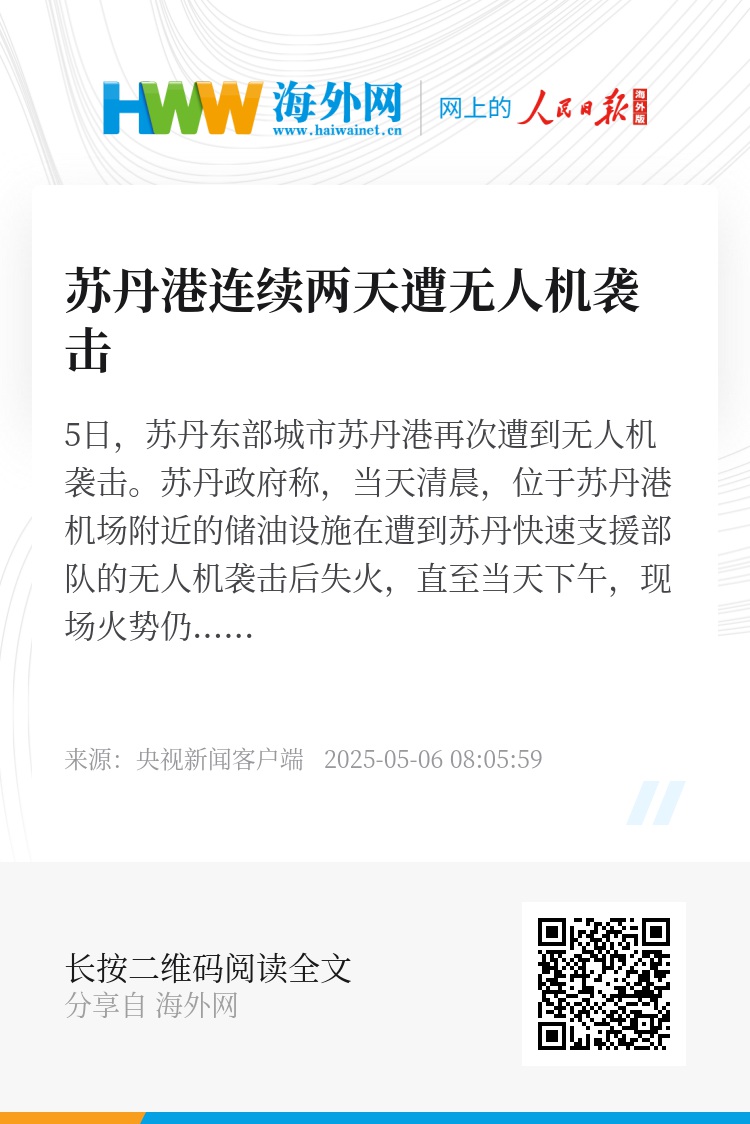 5日,苏丹东部城市苏丹港再次遭到无人机袭击。苏丹政府称,当天清晨,位于苏丹港机场附近的储油设施在遭到苏丹快速支援部队的无人机袭击后失火,直至当天下午,现场火势仍未被扑灭。对此,苏丹快速支援部队尚未作出回应。